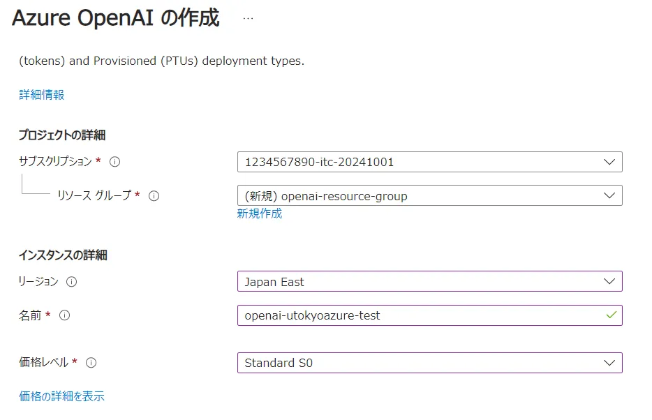 openai-utokyoazure-testとしています. - 価格レベル: