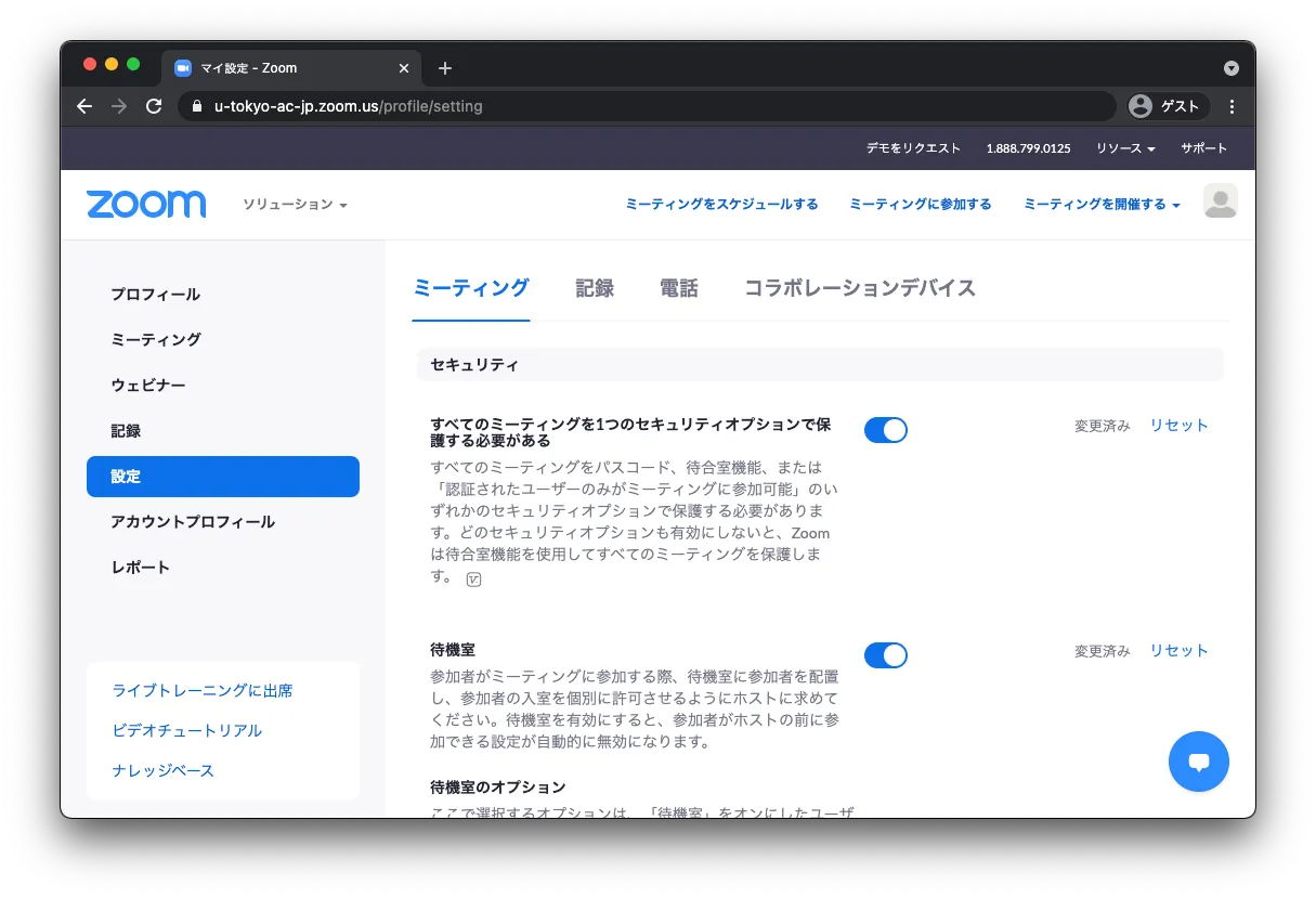 2021年春のシステム変更後,東京大学のZoomアカウントは @utac.u-tokyo.ac.jp に変更されました.このため,これまでドメインの設定を g.ecc.u-tokyo.ac.jp としていた場合,そのままの設定では東京大学のアカウントに正しくサインインしているユーザが会議室に入れなくなります.必ず上記の通り *.u-tokyo.ac.jp に変更してください.